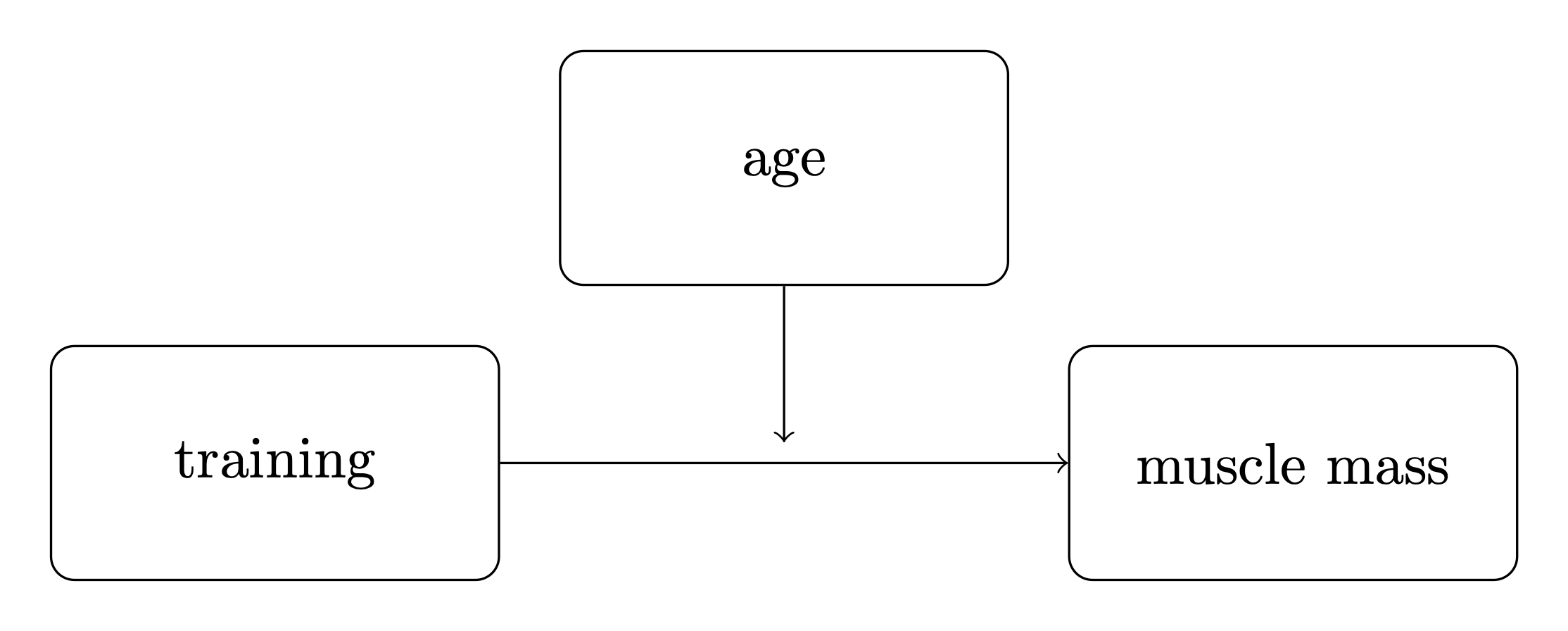 I’ve taken inspiration from a blog post van den Berg [n.d.] which examines whether age influences (moderates) the effect of training on muscle percentage. We might speculate that more training results in higher muscle mass, at least for younger people. But it might be the case that the relationship between training and muscle mass changes with age - perhaps training is less effective at increasing muscle mass in older age?